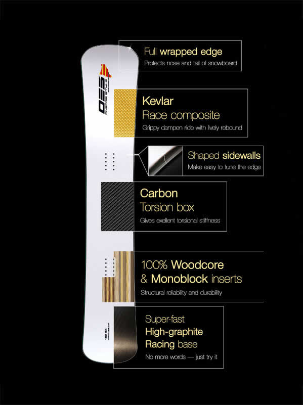 The Titanal construction is improved with two new technologies: Phenol Sidewalls and Tail Reinforcement by Vectran and Kevlar. This makes snowboards of the World Cup line even more suited to the demands of the racecourse. Except wide.