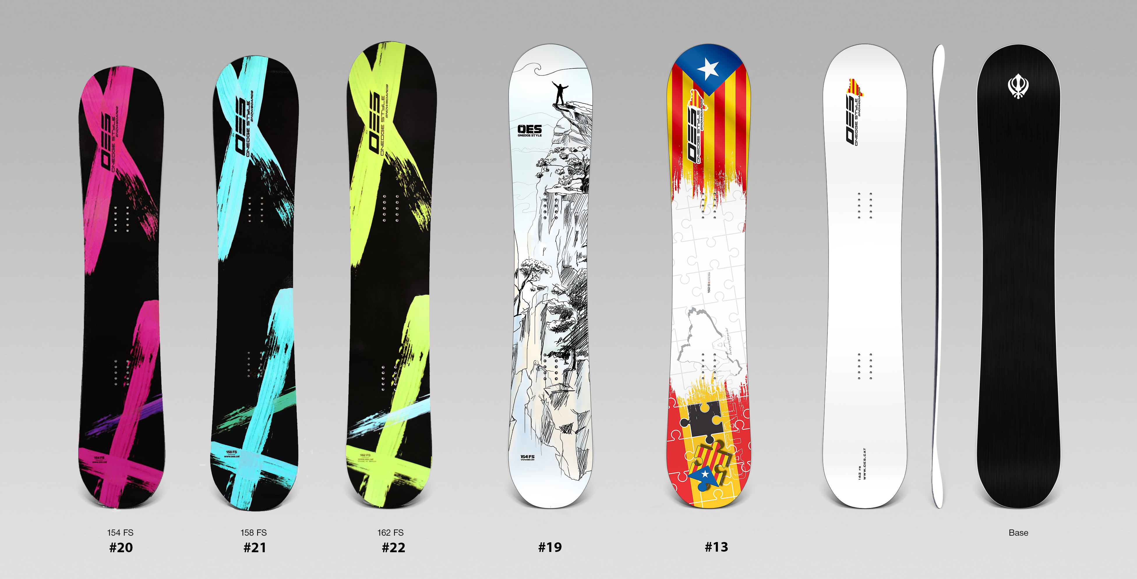 The customary snowboard topsheet is white with OES logo. Board Fiberglass — logo without the flag.