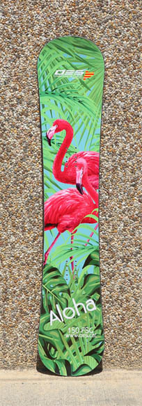 The customary snowboard topsheet is white with OES logo. Board Fiberglass — logo without the flag. For 155 FSG — topsheet Aloha.